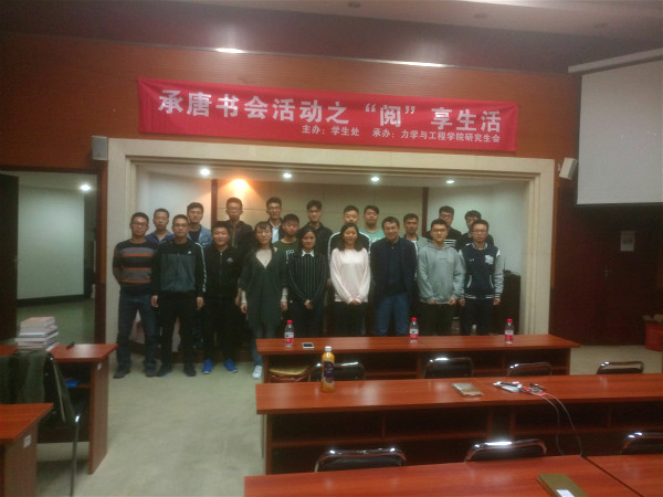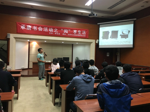 11月9日晚7时,由77779193永利官网学生处主办,力学与工程学院研究生会承办的承唐书会之“阅”享生活活动在九里校区综合楼二楼学术报告厅顺利举行。此次活动邀请李翔宇老师、张英蓉老师担任评委,全体研究生一同聆听。
