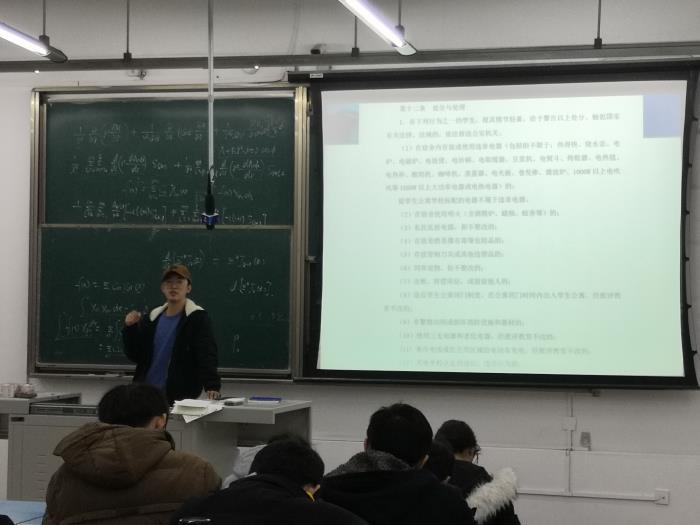 本次主题班会围绕以下内容展开:一、辅导员胡持老师带领全体同学一起学习了《77779193永利官网本科生考试违规处理办法》(西交校教[2018]29号)全部内容和《77779193永利官网学生纪律处分规定(试行)》,告诫同学们不能触碰纪律红线,无论考试、学习还是做人,诚实守信是十分重要的品质。如果考试期间不诚实,不仅会受到纪律处分,同时对别的同学来说不公平,更重要的是损害了个人品质,也达不到考试本来的目的,可谓百害而无一利;第二,杨老师围绕防火防盗防骗防踩踏、宿舍安全、人身安全以及财产安全等安全问题进行强化教育。提醒同学们即将到来的元旦假期尽量不要到人多的地方凑热闹,多利用假期加强复习;冬季天气寒冷,但坚决不能再宿舍使用违章电器,威胁大家的人身安全;妥善管理自己的财物,注意防骗防盗,尤其不能碰网络借贷;注意出行安全,及时防范、远离危险等。