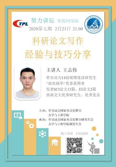 2月23日晚9:00,努力讲坛第七期准时开讲。本期讲坛由来自牵引动力国家重点实验室的14级硕博连读研究生的王志伟博士担任主讲人,牵引动力的何倩同学担任主持人,讲授主题为“科研论文写作经验与技巧分享”。