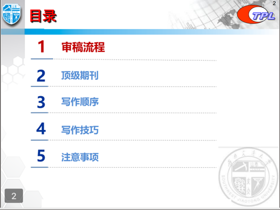 第四部分:写作技巧。首先要有好的标题;其次摘要要具有独立而完整的结构体系;引言要简洁明了,并且要讲明研究的必要性和迫切性,重点要将最新的进展和过去经典文献的引用概括总结出来,要遵循实事求是原则;结果要将呈现的内容清晰、准确严密地表达出来,讨论则要做到有重点、有条理和分层次;论文的结论要给读者留下技术研究的主要工作核心的成果的印象;最后在引用参考文献时要尽量使用原始文献。