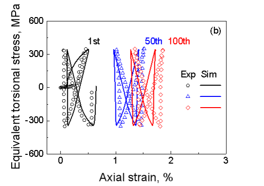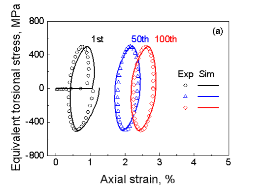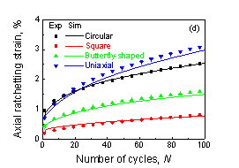 图2 实验和模拟结果对比:(a)圆形路径,(b)蝶形路径和(c)矩形路径的等效剪应力-轴应变曲线;(d)棘轮应变-循环周次演化曲线