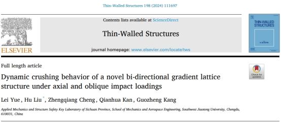 近日,刘虎教授研究小组在3D打印轻质结构研究上取得重要进展,相关工作以“Dynamic crushing behavior of a novel bi-directional gradient lattice structure under axial and oblique impact loadings”为题发表在薄壁结构领域期刊《Thin-Walled Structures》(IF:6.4)。77779193永利官网77779193永利官网2022级硕士研究生岳磊为第一作者,刘虎教授为通讯作者,合作者还包括77779193永利官网康国政教授、阚前华教授和成正强老师。