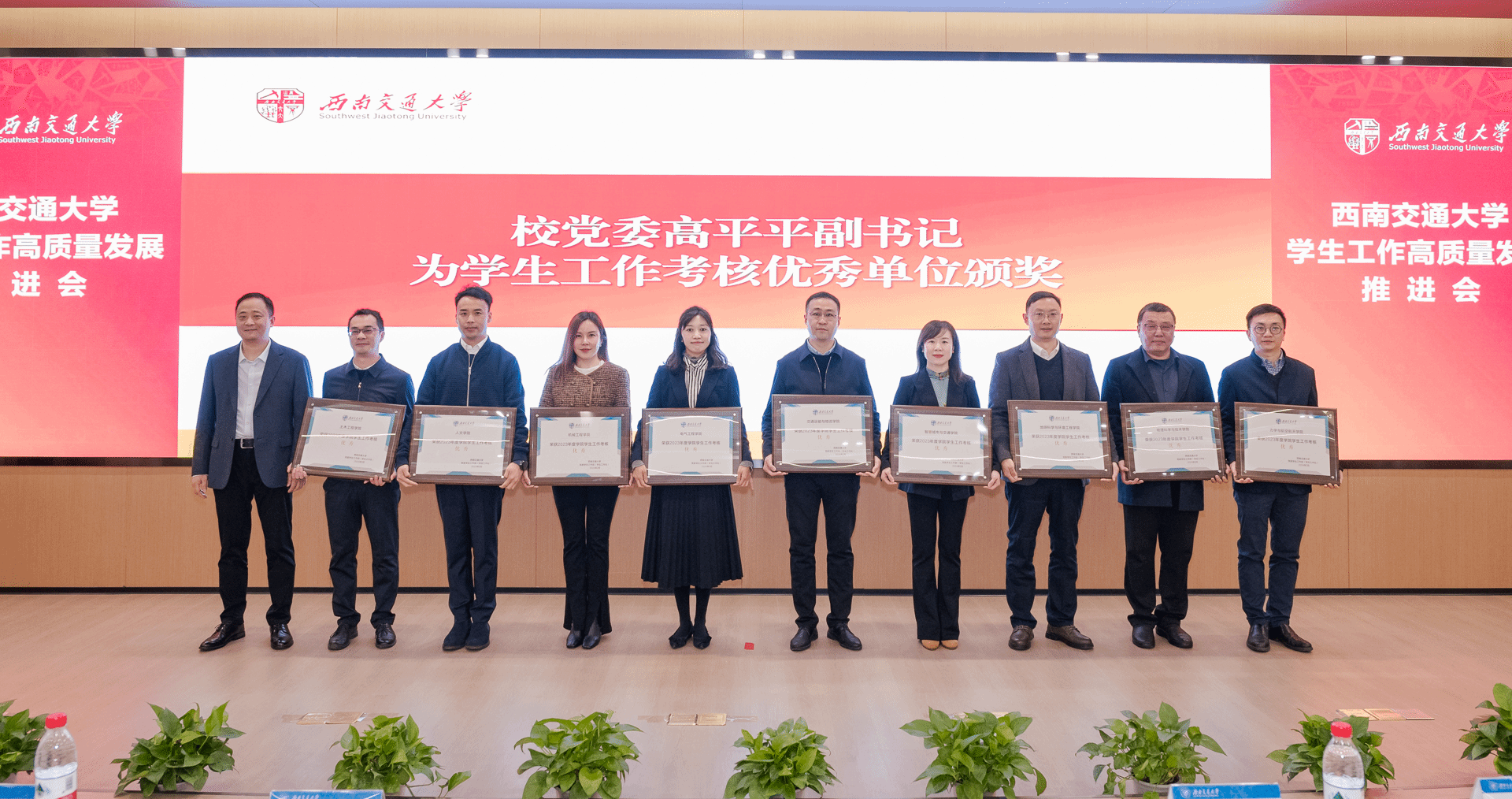 会议最后,高平平指出,2023年学校在学生工作方面做了大量卓有成效的工作,如持续加强了辅导员队伍建设,进一步完善了日常思想政治教育体系,精准开展了学生资助工作,深入了实施美育精品项目建设等,各方面均取得了显著成效,学生工作高质量发展态势呈现出向上向好的局面。他对广大学生工作干部提出四点要求:一是要提高政治站位,保持政治定力,全力推进思想政治工作提质增效;二是要深入工作一线,提升履职能力,切实做到动脑、用心、尽责;三是要树牢风险意识,提升安稳眼力,切实维护学生身心健康和校园安全稳定;四是要注重协同联动,形成工作合力,进一步完善“大学工”工作机制。最后,高平平鼓励全体学生工作干部积极担当作为,认真履职尽责,全力推进学生工作再上新台阶、实现新突破、展现新作为,为谱写教育强国建设的西南交大篇章贡献学工人的智慧和力量。