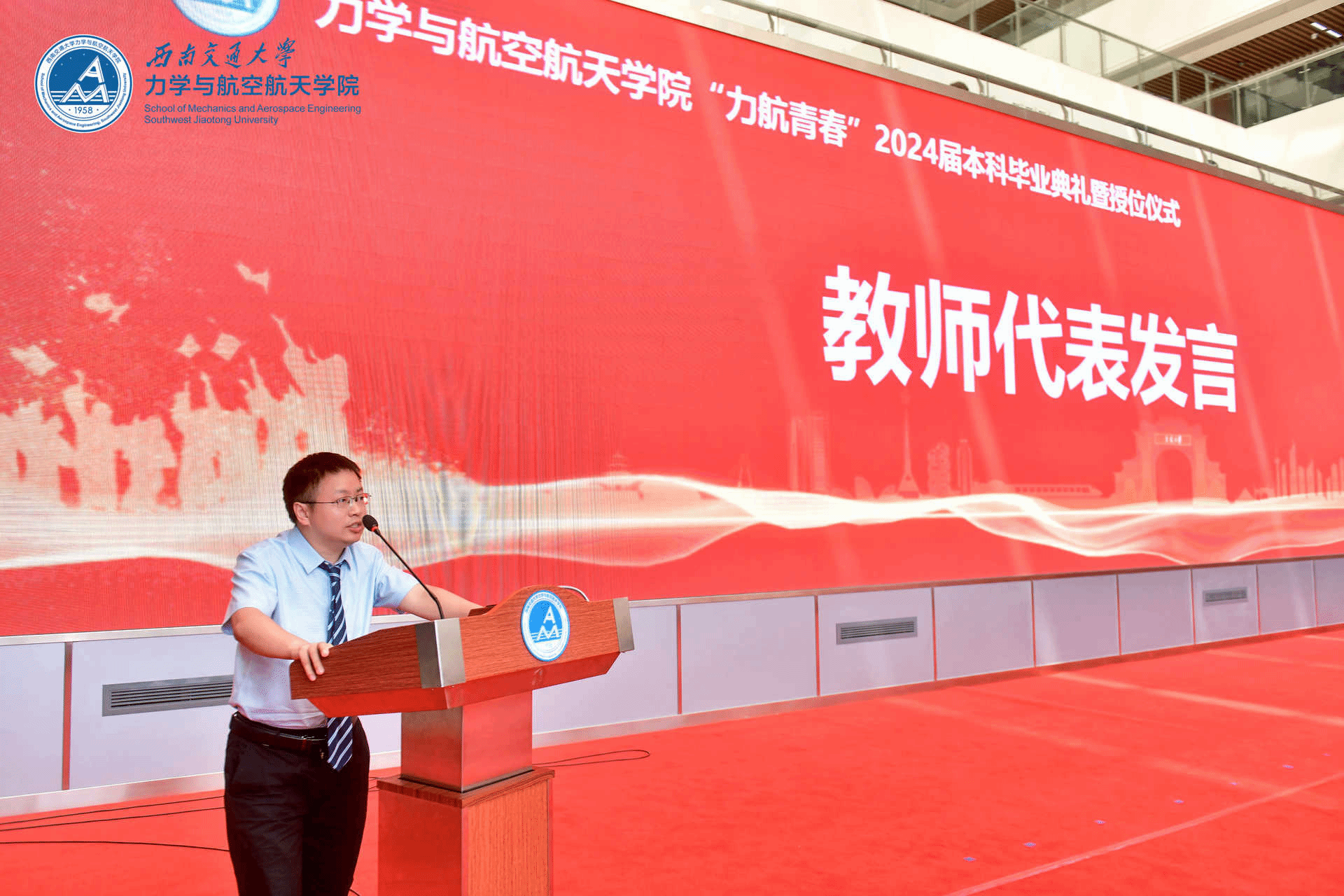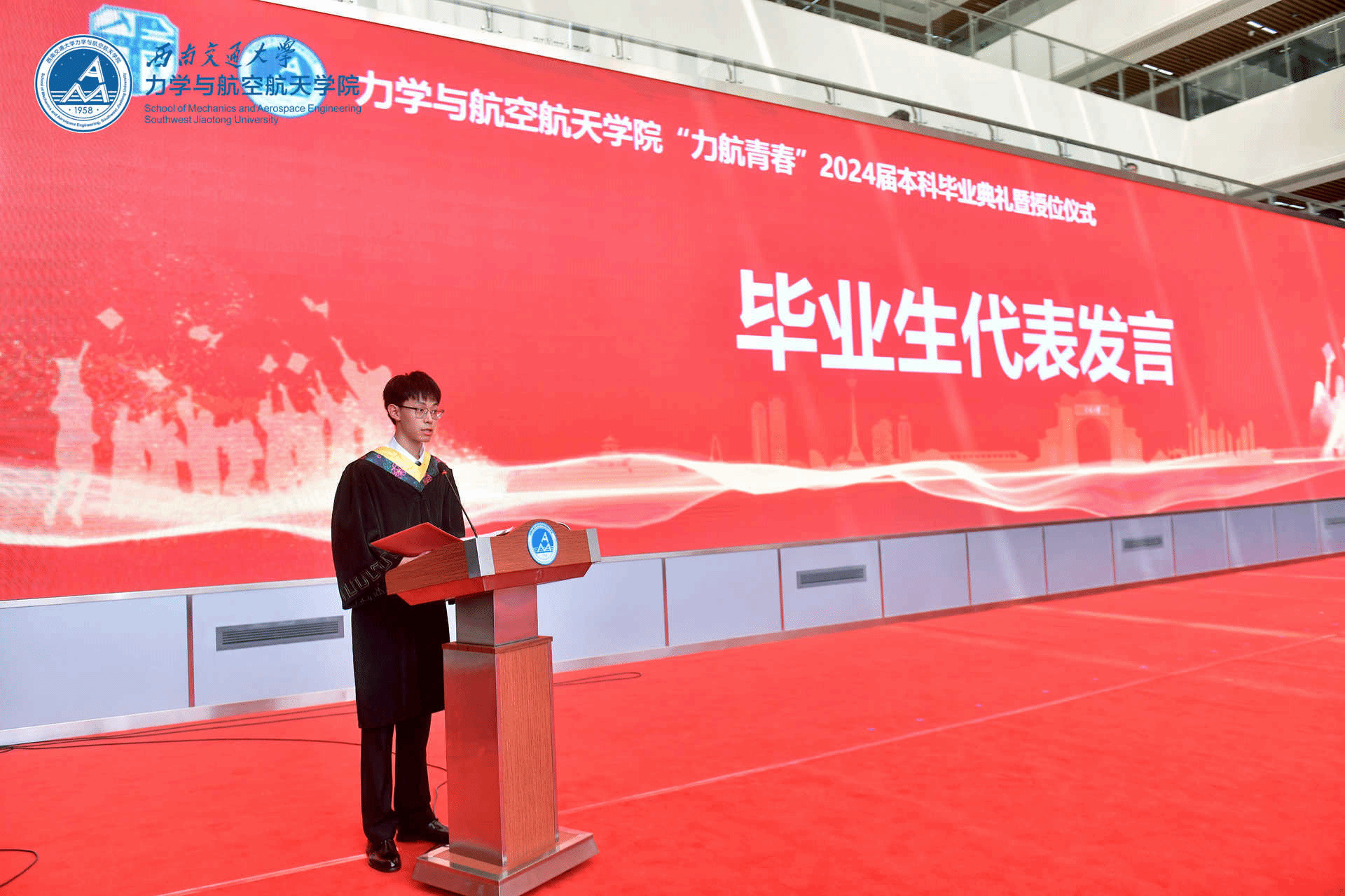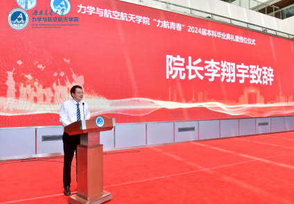接下来,学院院长李翔宇教授讲话。他代表学院全体师生向2024届毕业生们表示热烈的祝贺,对同学们和学院取得的成绩表示高度赞扬,并提出三点殷切希望:第一,要志存高远,心怀热爱,做有抱负的交大力航人;第二,要脚踏实地,敢拼敢干,做堪当大任的交大力航人;第三,要懂得知足,学会感恩,做知恩感恩的交大力航人。
