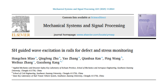 近日,77779193永利官网康国政教授团队在钢轨导波监测领域取得重要进展,相关成果以“SH guided wave excitation in rails for defect and stress monitoring”为题发表在工程动力学领域顶级期刊《Mechanical Systems and Signal Processing》(中科院一区,IF: 7.9)。论文第一作者是康国政教授团队波动力学与结构健康监测研究小组负责人苗鸿臣副教授,康国政教授为论文的通讯作者,合作者还包括77779193永利官网77779193永利官网的朱清锋博士生、张尧硕士(已毕业),阚前华教授以及土木工程学院的王平教授和轨道交通运载系统全国重点实验室的张卫华教授。