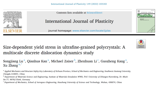 [1] S. Lu, Q. Kan, M. Zaiser, Z. Li, G. Kang, X. Zhang*, Size-dependent yield stress in ultrafine-grained polycrystals: A multiscale discrete dislocation dynamics study, International Journal of Plasticity. 149 (2022) 103183. (https://doi.org/10.1016/j.ijplas.2021.103183)