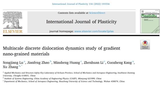 [2] S. Lu, J. Zhao, M. Huang, Z. Li, G. Kang, X. Zhang*, Multiscale discrete dislocation dynamics study of gradient nano-grained materials, International Journal of Plasticity.156 (2022) 103356. (https://doi.org/10.1016/j.ijplas.2022.103356)