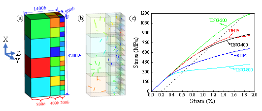 (3)在三维多尺度离散位错动力学框架中建立了梯度晶粒结构模型(图2a, b),研究了梯度结构材料的力学行为及其内在微观机理。模拟结果显示梯度晶粒试样的屈服应力和硬化率大于通过混合法则(Rule of Mixture)得到的值(图2c),表明梯度结构材料具有协同强化效应。对于梯度晶粒试样,其微结构演化结果表明位错首先在大晶粒内激活和运动,并逐渐扩散到更小的晶粒中,不同晶粒尺寸梯度层的先后屈服导致应力和应变沿梯度方向上呈梯度分布。此外,模拟发现梯度晶粒试样的包辛格效应比均匀晶粒试样更加显著,这表明梯度晶粒试样在塑性变形过程中具有更强的背应力强化。最后,基于卸载阶段位错演化的特征建立了可以同时描述梯度晶粒和均匀晶粒试样包辛格效应的理论模型。本研究从亚微米尺度的离散位错动力学角度进一步揭示梯度纳米结构金属材料的变形机理,可为梯度纳米结构材料的优化设计提供理论指导。