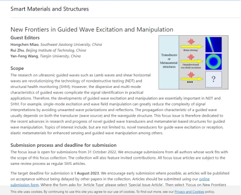近日,永利官网77779193永利官网苗鸿臣副教授受邀担任智能材料与结构力学领域权威期刊《Smart Materials and Structures》(2021年影响因子为4.131,永利官网期刊分级为A类期刊,中国材料学会T1区期刊)客座编辑(Guest Editor)。苗鸿臣副教授将和北京理工大学朱睿教授及天津大学王艳锋副教授一起负责“导波激励与调控的前沿进展(New Frontiers in Guided Wave Excitation and Manipulation)”专题的组稿与评审工作。该专题的网址如下:https://iopscience.iop.org/journal/0964-1726/special/0964-1726_guided-wave-excitation-manuipulation。