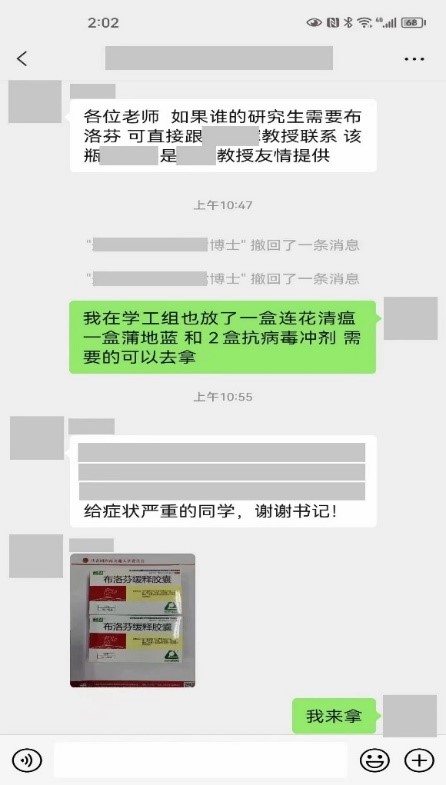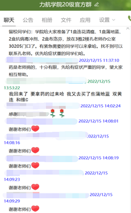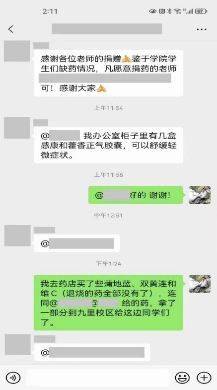 收到药物后,学院学生工作组老师们立即将药品信息在全院本、硕、博年级群里发布,戏称自己是“神雕大侠”的学院党委副书记将药品汇集起来后,在办公室门口设立了一个爱心药品共享药箱,连续多日给前来领药的师生们分发药品。他还开车多次到九里校区送去急需药品,然后由九里校区辅导员老师和学生骨干们分发给生病的同学们。