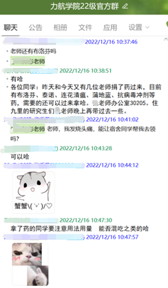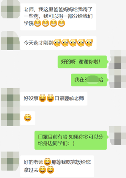 老师们的暖心举动得到同学们纷纷点赞,还有同学也加入了捐药队伍,向学院捐赠了20个N95口罩和布洛芬、快克等一批药品。他说:“一直以来都是不断接受学院老师同学的帮助,有机会能够回馈学院,用实际行动帮助到同学们也是一件幸事。”