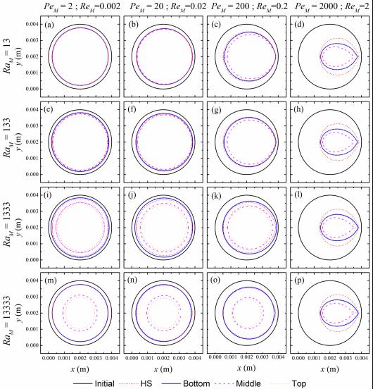 图2不同雷诺数、佩克莱特数和瑞利数下,石膏微柱经过900秒溶解后的二维Hele-Shaw(HS)模型结果与直接数值模拟的横截面形貌(Bottom, Middle和Top分别代表微柱的底部、中部和顶部)对比。