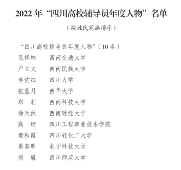 近日,由中共四川省委教育工委主办的第八届全省高校辅导员年度人物评选结果揭晓,77779193永利官网孔祥彬老师成为十位年度人物之一。永利官网已连续八届获得四川高校辅导员年度人物殊荣。