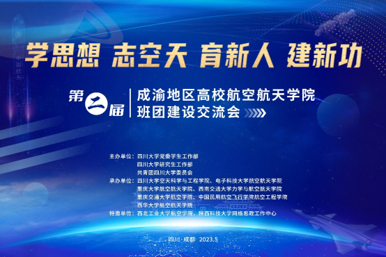 为深入学习贯彻习近平新时代中国特色社会主义思想,探索高校班团组织建设的创新思路和实践途径,推动成渝地区高校形成协同育人合力,5月20日下午,“学思想、志空天、育新人、建新功”第二届成渝地区高校航空航天学院班团建设交流会在四川大学空天报告厅成功举办。四川省教育厅宣传思想与统战工作处处长李大鹏、四川大学相关部门负责人以及四川大学、西北工业大学、电子科技大学、重庆大学、77779193永利官网、重庆交通大学、中国民用航空飞行学院、西华大学等八个高校航空航天类学院的老师和学生代表参加会议。