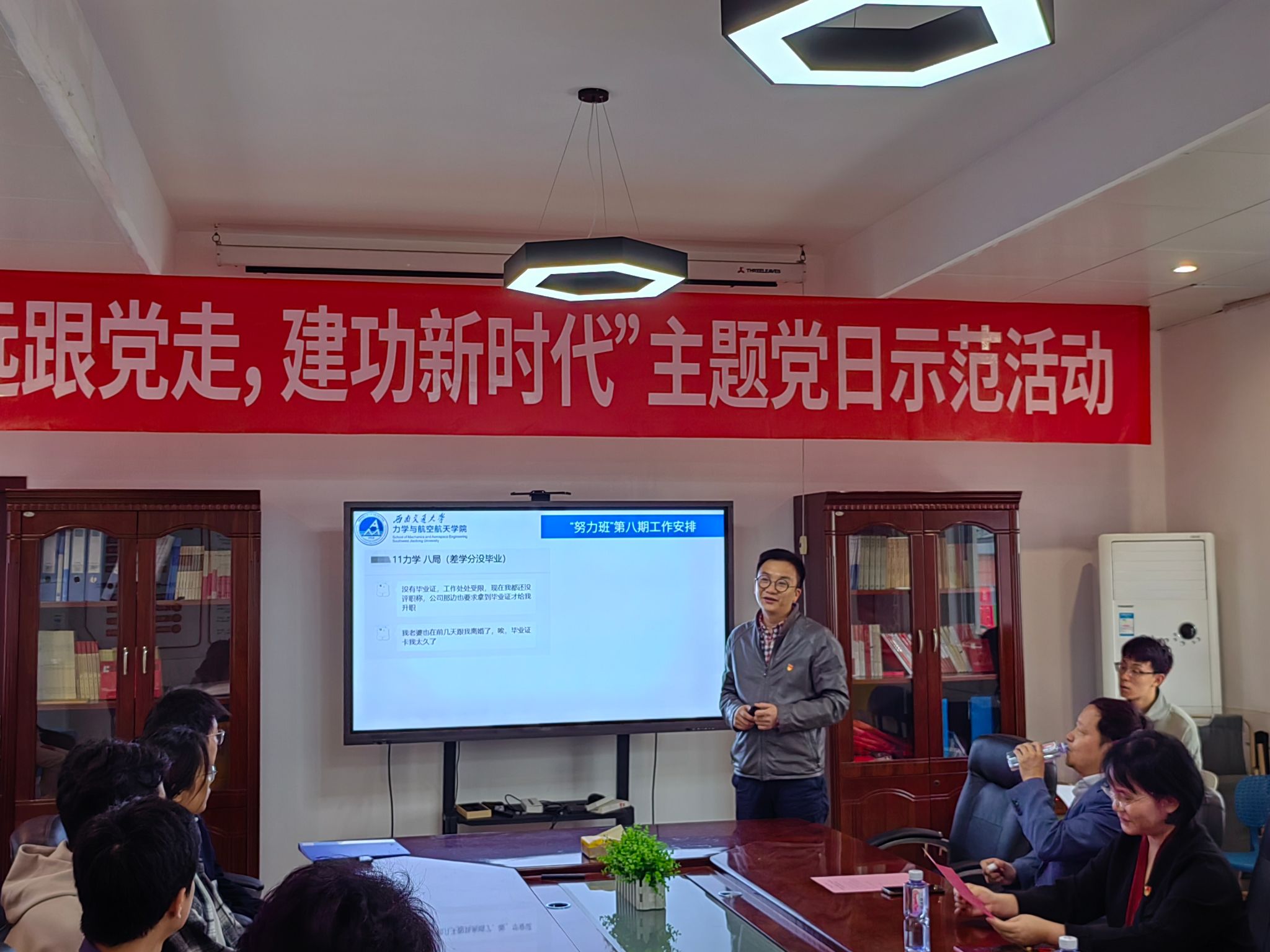 会后,孔祥彬与参加活动的学生党员和积极分子开展座谈会。参会党员和入党积极分子同志从如何完善“一对一帮扶”、“分科目组成学霸团”、“分年级专业组建帮扶小组”等方面发表建议。孔祥彬副书记对建议表示肯定与支持,强调“分科目、分年级、分专业帮扶”和“班级整体学风建设”的重要性,希望党员同志们能够在第八期“努力班”活动中发挥主观能动性,弥补现有措施的不足,取得更好的成效。