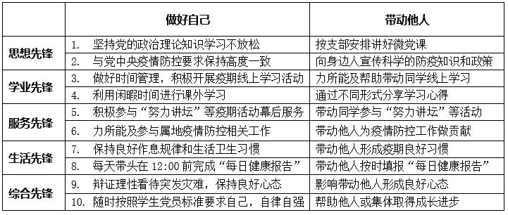 请学院各学生党支部积极组织学生党员自觉对标“五个先锋”要求,并从做好自己和带动他人两个方面完成关键任务清单(见表1)。请各党支部按照学校学工部要求组织开展“爱国力行 先锋战疫”云上组织生活会,对本通知进行学习,并安排相关内容。学院党委将在疫情告一段落后组织各党支部召开专题生活会,每一位党员要对自己“五个先锋”作用发挥情况进行述职,学院党委将对表现突出的支部和个人进行表彰。