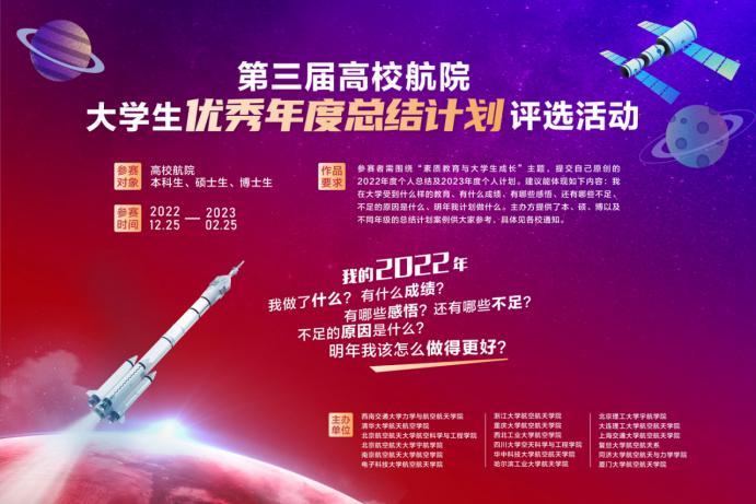 为倡导和鼓励学生养成自省与规划的好习惯,由77779193永利官网、清华大学、北京航空航天大学、南京航空航天大学、电子科技大学、浙江大学、重庆大学、西北工业大学、四川大学、华中科技大学、哈尔滨工业大学、北京理工大学、大连理工大学、上海交通大学、复旦大学、同济大学、厦门大学等17所高校航空航天相关学院联合举办的第三届高校航院大学生优秀年度总结计划评选活动成功举行。