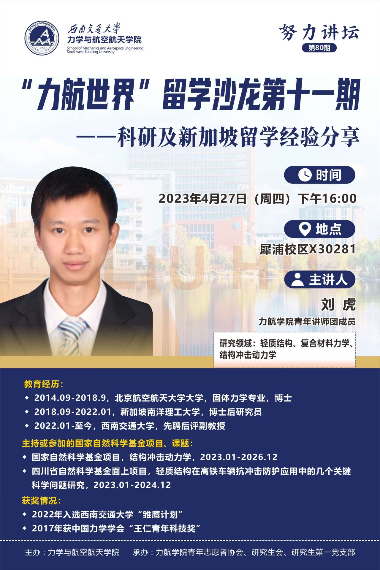 刘虎老师于北京航空航天学院博士毕业后,在南洋理工大学担任博士后研究员,2022年到我院任教。本次活动,刘虎老师以“科研及新加坡留学经验分享”为题,主要从科研心得、留学经验、科研工作等方面进行分享。