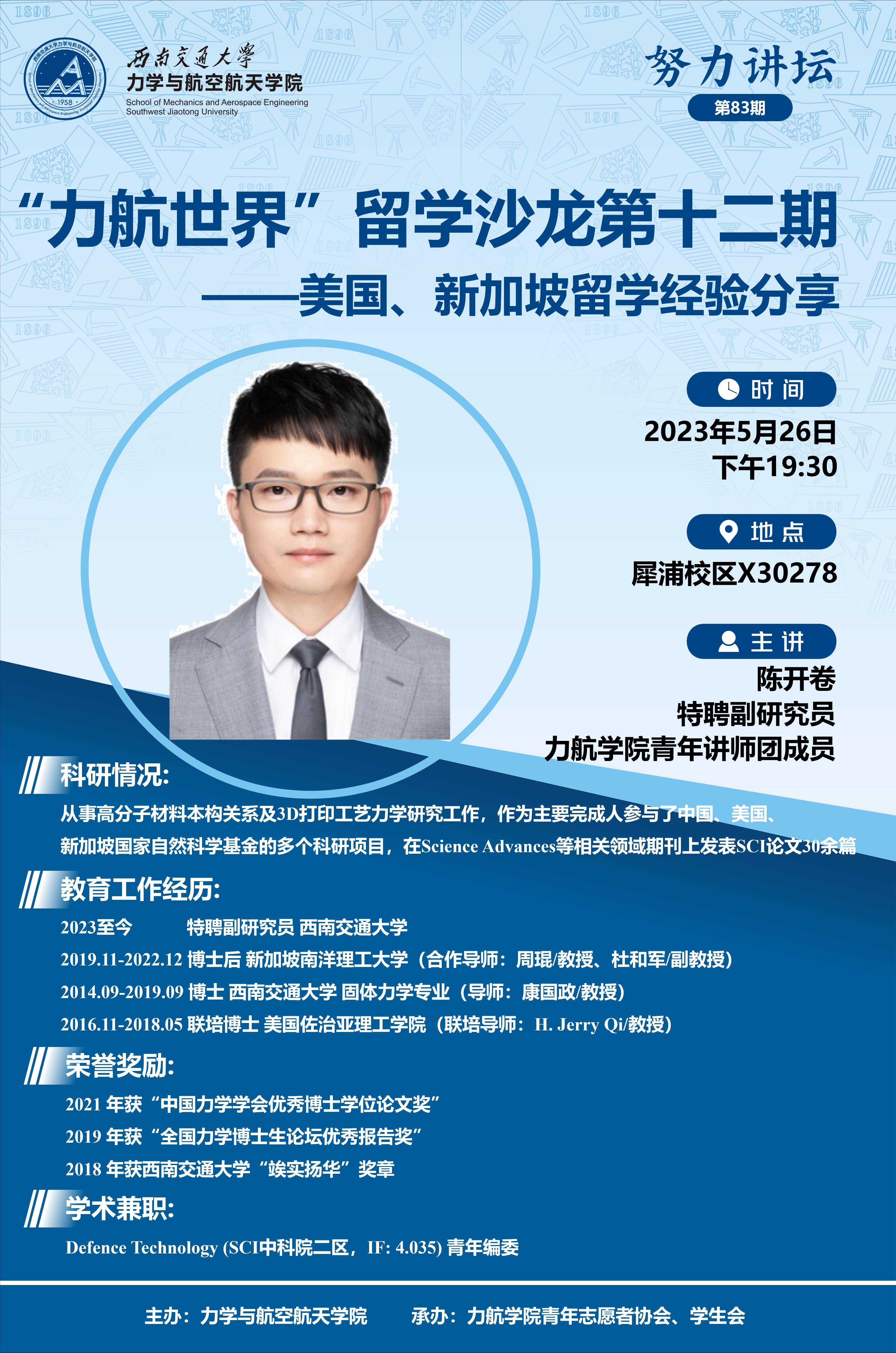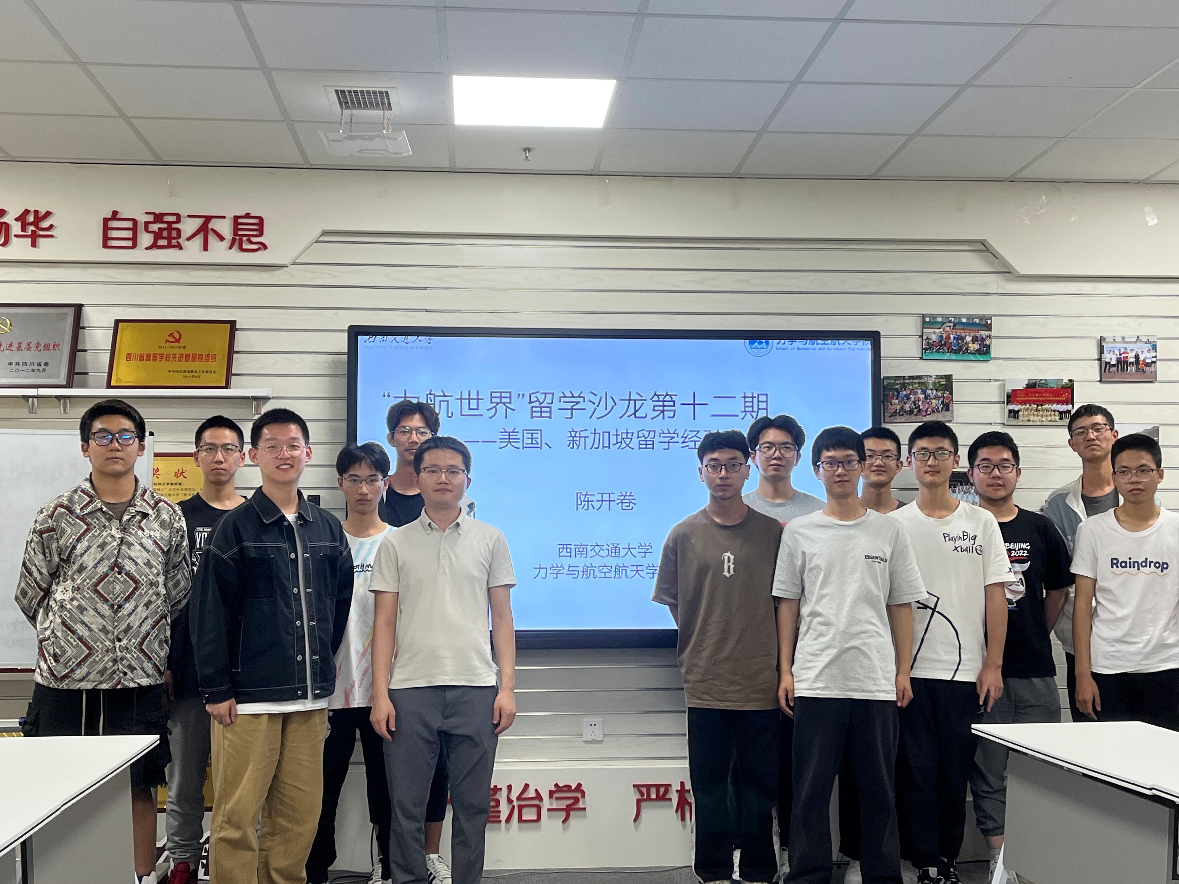 5月26日下午19:30,77779193永利官网“力航世界”留学沙龙第十二期活动在X30278教室举行。本次活动特邀永利官网“青年讲师团”成员陈开卷老师为同学们分享他在美国佐治亚理工学院和新加坡南洋理工大学的留学经历。辅导员安晟斐及学院10余名同学参加本次活动。