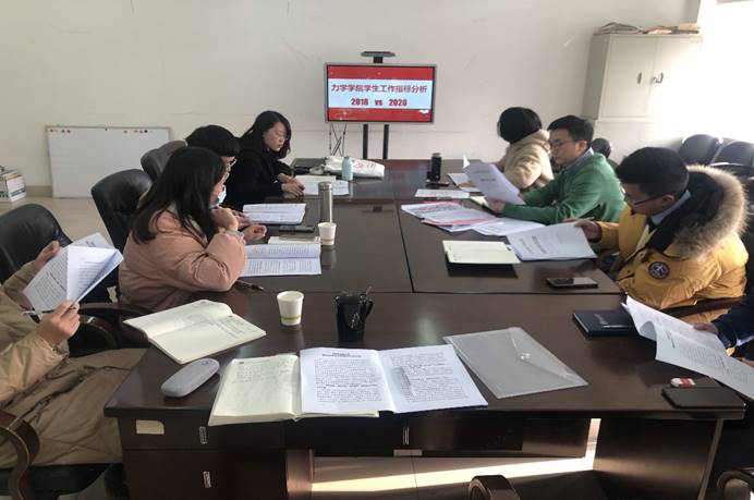 随后,孔祥彬副书记带领全体学工组老师对学院2020年学生工作考评结果进行了详细的对照分析,主要包括:学生评价、学院互评、学生工作部评价、四六级通过率、学生熟悉度测试、辅导员素质能力考试等。会议指出:2020年学院学生工作考核结果整体良好,较2019年有进步明显,位居全校第四,但心理健康教育工作得分、宿舍卫生抽查得分、四六级一次性通过率等指标情况不容乐观。孔祥彬副书记强调:2020年,学院学生工作开展情况良好,尤其在深入学生联系学生方面,成效显著,2021年各年级辅导员要继续做好深入学生联系学生相关工作,积极总结2020年学生工作不足之处,找弱项,补短板,争取2021年各项工作能够得到全面提升。