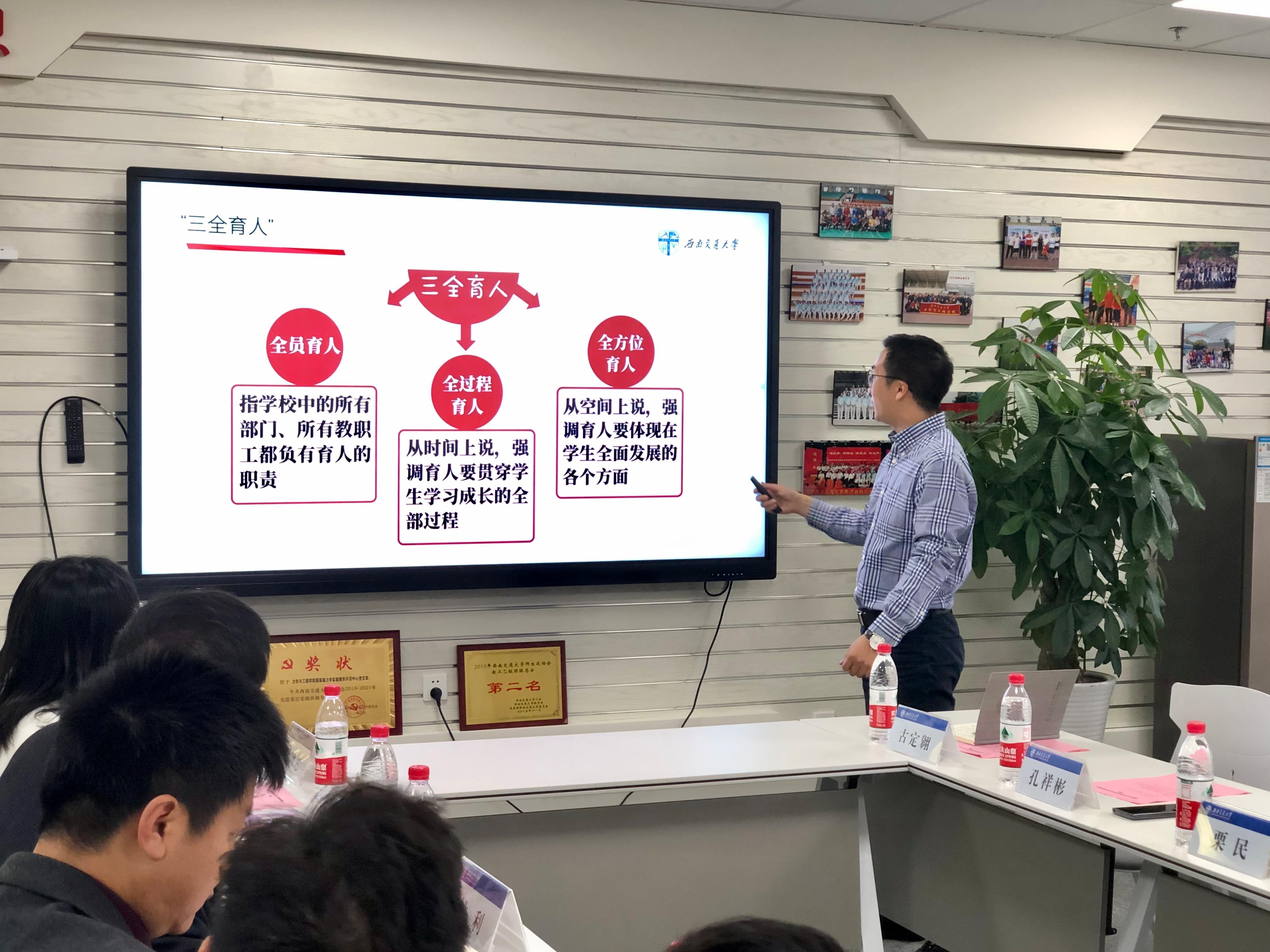 紧接着,孔祥彬对学院“三全育人”工作进行了全面介绍。孔祥彬从“三全育人”的工作设计原则出发,介绍了学院在“全员育人”、“全方位育人”以及“全过程育人”三个方面所做的具体工作项目:学习战疫之“努力讲坛”、学业帮扶之“努力班”、“原原本本学党史”力学数学物理擂台赛、学生党建之“先锋力行动”、文化育人之“双严”文化传承与弘扬、新生研讨课《大学之道》课班一体化模式、研究生学业导引课《大国动力》的学教协同模式、深入学生联系学生“三因工作法”、基础力学课程优秀作业笔记评选以及七校航院大学生年度优秀总结计划评选活动,展示了近期学院在推进四川省首批“三全育人”综合改革院系试点工作中所取得的成效,分享了在工作中的感悟和体会。