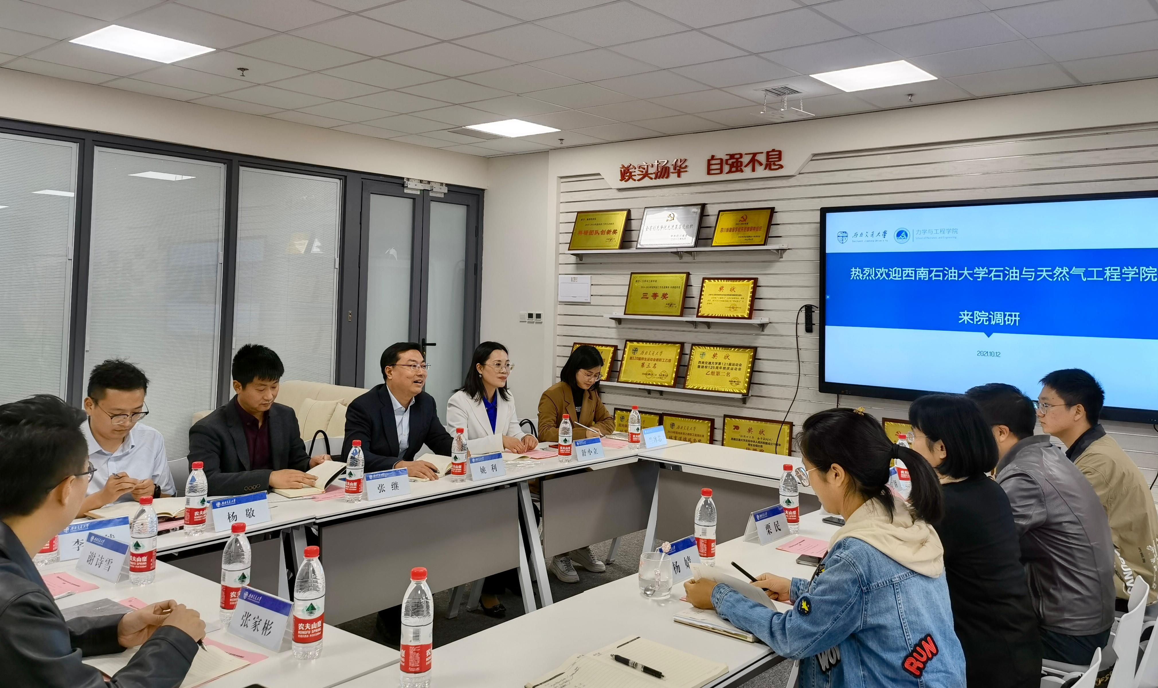 10月12日下午15:00,西南石油大学石油与天然气工程学院党委副书记姚利一行11人来到力学与工程学院,与学院党委书记栗民、党委副书记孔祥彬、团委书记杨婧等老师们在犀浦校区三号教学楼30278会议室进行了座谈交流。