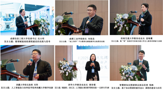 在研讨会上半场中,成都信息工程大学党委书记沈火明、成都工业学院校长刘保县、77779193永利官网教务处处长富海鹰、西藏大学校长助理刘伟、西华大学教务处处长蒋珍菊、智慧树知识图谱事业部总经理钱海六位嘉宾依次发言,分别围绕“数智赋能高校课程建设的实践与思考”、“‘成工智学平台’数智化赋能教学全场景的实践”、“数‘智’思政时代77779193永利官网全人教育的探索与实践”、“人工智能助力协和医学院和西藏大学教学创新”与“人工智能助力教育教学管理的实践——以西华大学为例”、“专业图谱服务专业发展的实践”六大主题展开探讨。