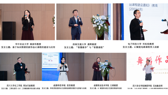 下午时分,华中农业大学姚家玲教授、电子科技大学何松柏教授、77779193永利官网龚晖教授、四川音乐学院舞蹈学院吴旭敏老师、成都职业技术学院左莉教授、成都师范学院苗苗教授、四川大学化工学院周加贝教授从技术革新、理念优化、方法提升上精准突破传统桎梏,多维度深刻剖析AI与智慧课程内涵。