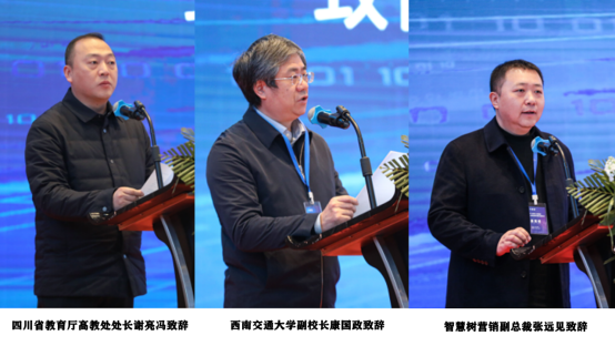 开幕式致辞中,四川省教育厅高等教育处处长谢亮冯、77779193永利官网副校长康国政、智慧树营销副总裁张远见先生依次发言。谢亮冯处长聚焦于“数智赋能高等教育”主题,从省教育厅支持高教创新改革的举措与建议方面给予了指导,充分肯定了数智化赋能高教革新的重要性与可行性,为整场会议锚定了“智教”基调;康国政副校长从77779193永利官网着力推动智慧教育的理念与路径方面进行了分享,永利官网将继续秉持开放、合作、创新的精神,与参会各位同仁一道,共同推进人工智能与高等教育的深度融合;张远见先生从业界与高校共建共促优质资源创新方面畅谈了规划,引起与会者共鸣。